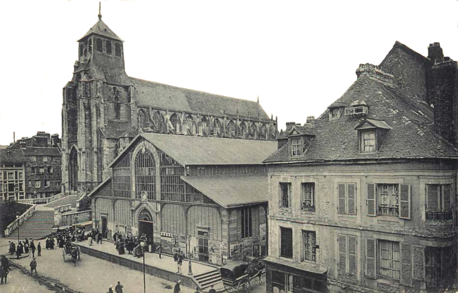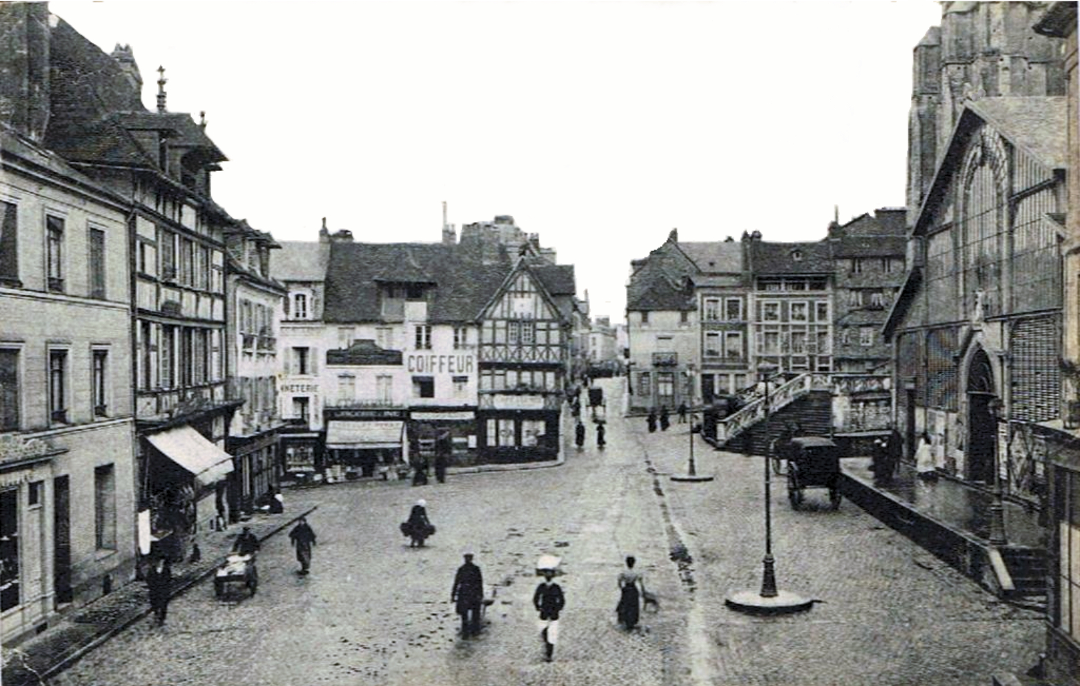 – Le Marché du Croquet, l’un des plus importants de la cité, se tenait en face du cimetière Saint-Jacques, sur une place qui portait le nom de Place du Croquet et que l’on désignait encore en 1785 sous celui de Place du Crochet. Cette place avait pour limites : d’un coté, le mur de soutènement des terres du cimetière, desquelles le niveau était alors surélevé d’environ quatre mètres (1) ; en face, le côté ouest de la place du Marché-aux-Boeufs ; d’un bout, le perron de l’église Saint-Jacques, et d’autre bout, l’entrée de la rue du Marché-aux-Boeufs , à sa jonction avec la rue d’Ouville.