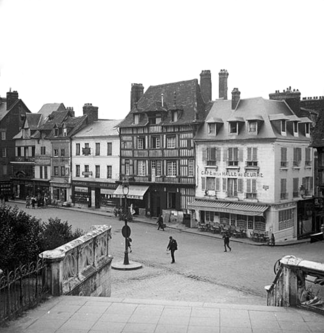 Annuaire du Lexovien 1938. La place Boudin-Desvergées, précédemment place du Marché-au-Beurre, commence boulevard Emile-Demagny n°22 (actuel Bd.Jeanne d’Arc). Finit rue du Marché-au Beurre, environ actuelle rue du 11 Novembre .