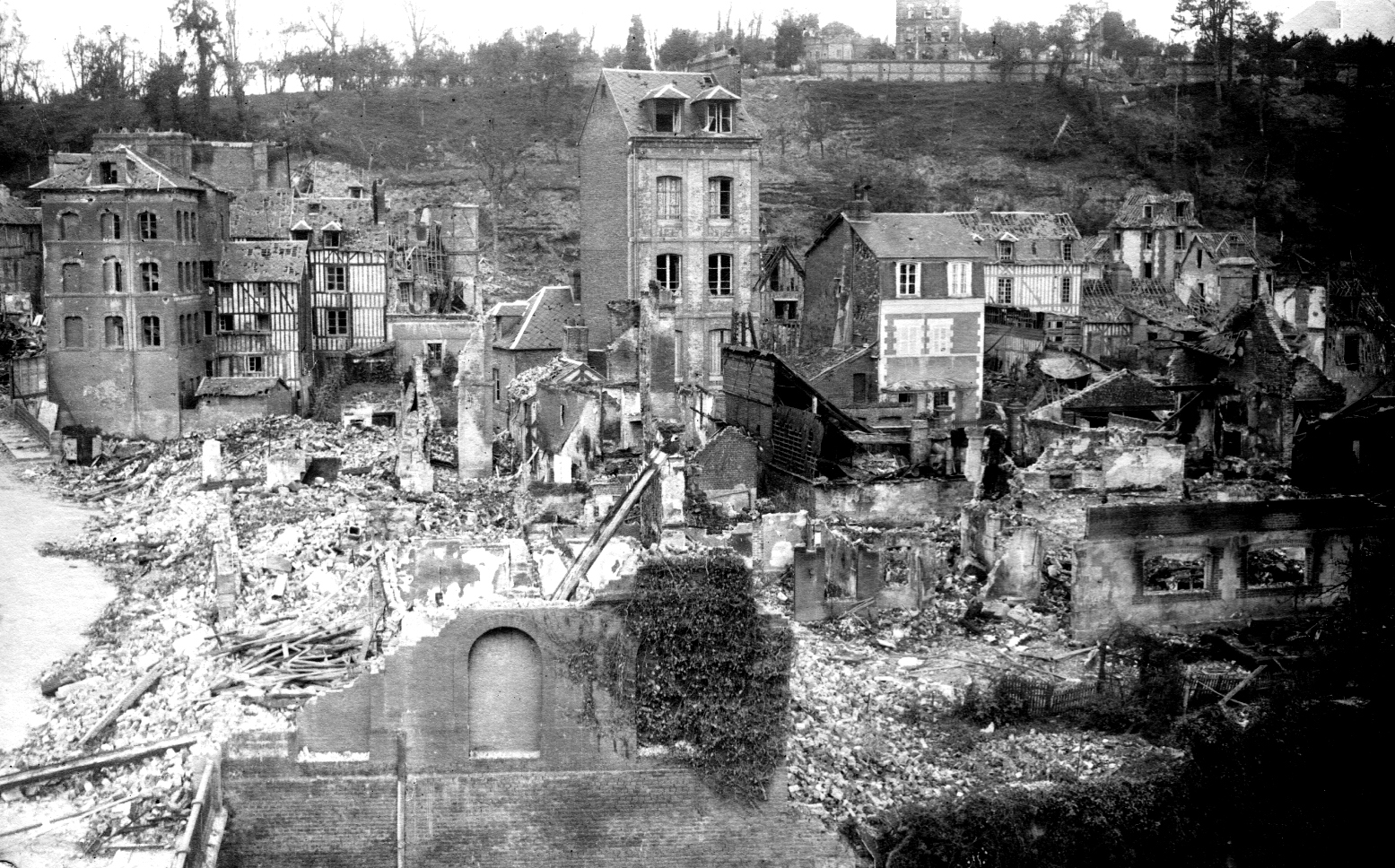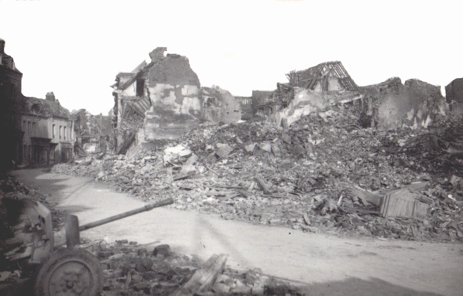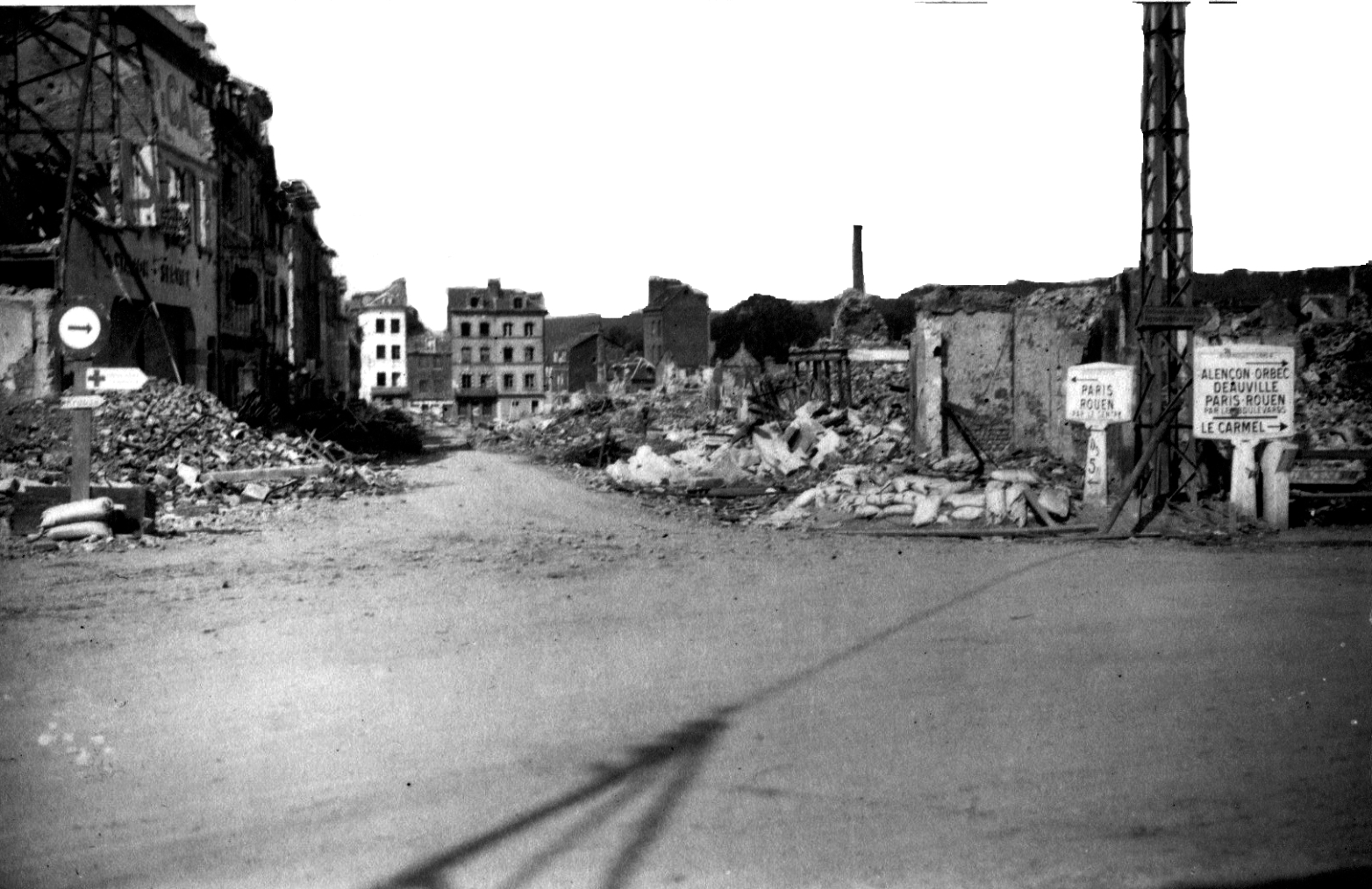 Fonds Jean-Denis GAUTIE. – 01 Photographies Lisieux en ruines : 4 CPA (Lisieux avant / après les bombardements) : rue vers St Jacques et la cathédrale, rue de Caen, Hôtel de ville, place du Marché au beurre -14×9 cm), par Real Photo. 1 photo, bas de la rue de Caen, en bas à gauche le pont de Caen.