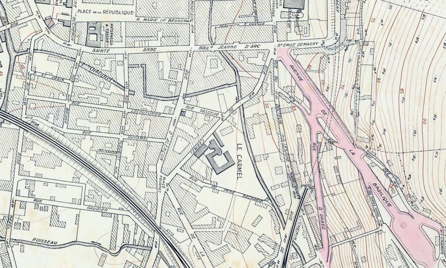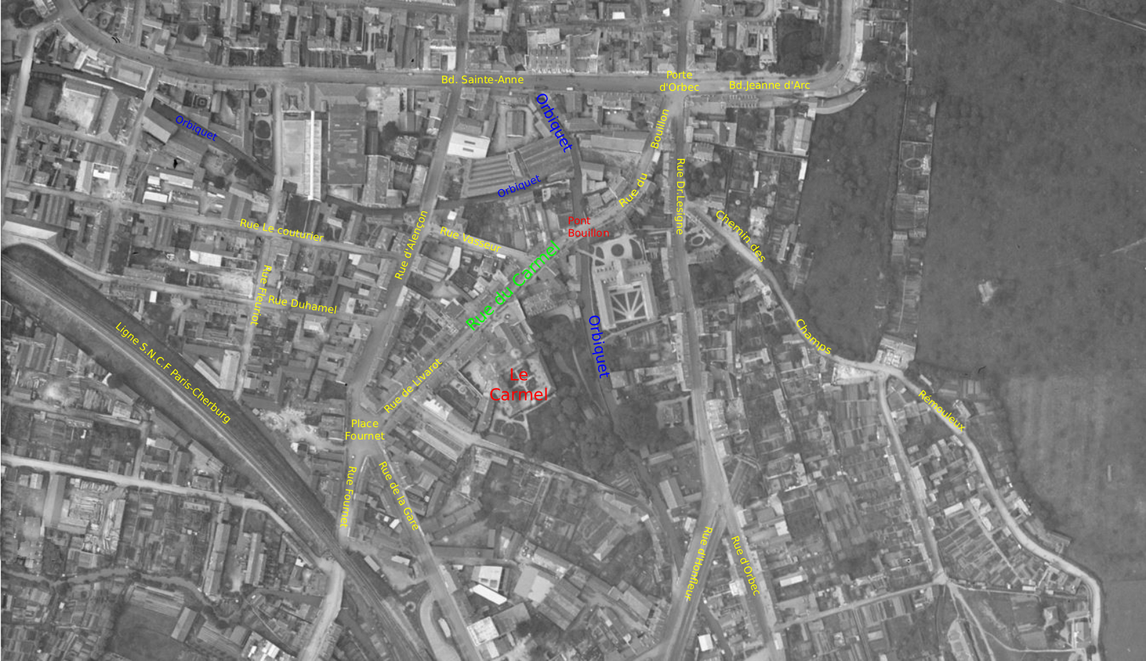 Carmel (rue du) : rue du Carmel 1937 PLL, 1939 AL, 1939 GIL,1944 PA, 1954 PLRV, 1955 LPDA 29, 1964 ACAA 1187, ~1973 PVLM, rue Carmel 1982 PTT, rue du Carmel 1995 PVLPA, 2001 PVAN, 2004 PTT, 2019 LVL. — Rue reliant actuellement la Porte d’Orbec (dite place Jean-Paul II) à la place Fournet. Au 18e siècle, elle se compose de deux tronçons différents : la rue Pont-Bouillon de la Porte d’Orbec au pont sur l’Orbiquet (petite passerelle de bois nommée Pont Bouillon), et la rue de Livarot de ce pont jusqu’à l’extrémité de la rue d’Alençon. Ces deux segments prirent le nom de rue de Livarot au 19e siècle, après élargissement et réfection de la voie. La rue, qui passe devant le Carmel [→] devint la rue du Carmel dans les années 1930, conséquence de la notoriété grandissante de la carmélite Thérèse Martin, du développement des pèlerinages et de la construction de la Basilique. Après la Seconde Guerre mondiale, le tracé rectiligne de l’ancienne rue de Livarot fut transformé en arc de cercle devant les bâtiments du Carmel, ce qui permit l’aménagement des parterres de fleurs actuels.