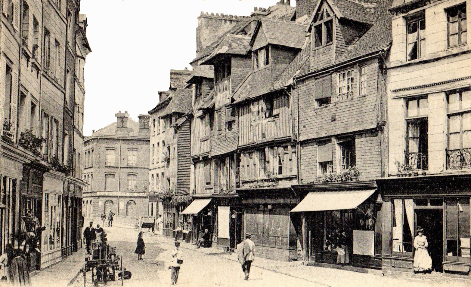Au 13e siècle, le prolongement du tronçon initial (de la place de la cathédrale à la Touques) s’appelait rue Saint-Germain, d’après l’église qui occupait la partie ouest de l’actuelle place François Mitterrand; elle traversait la paroisse du même nom [TL 53].