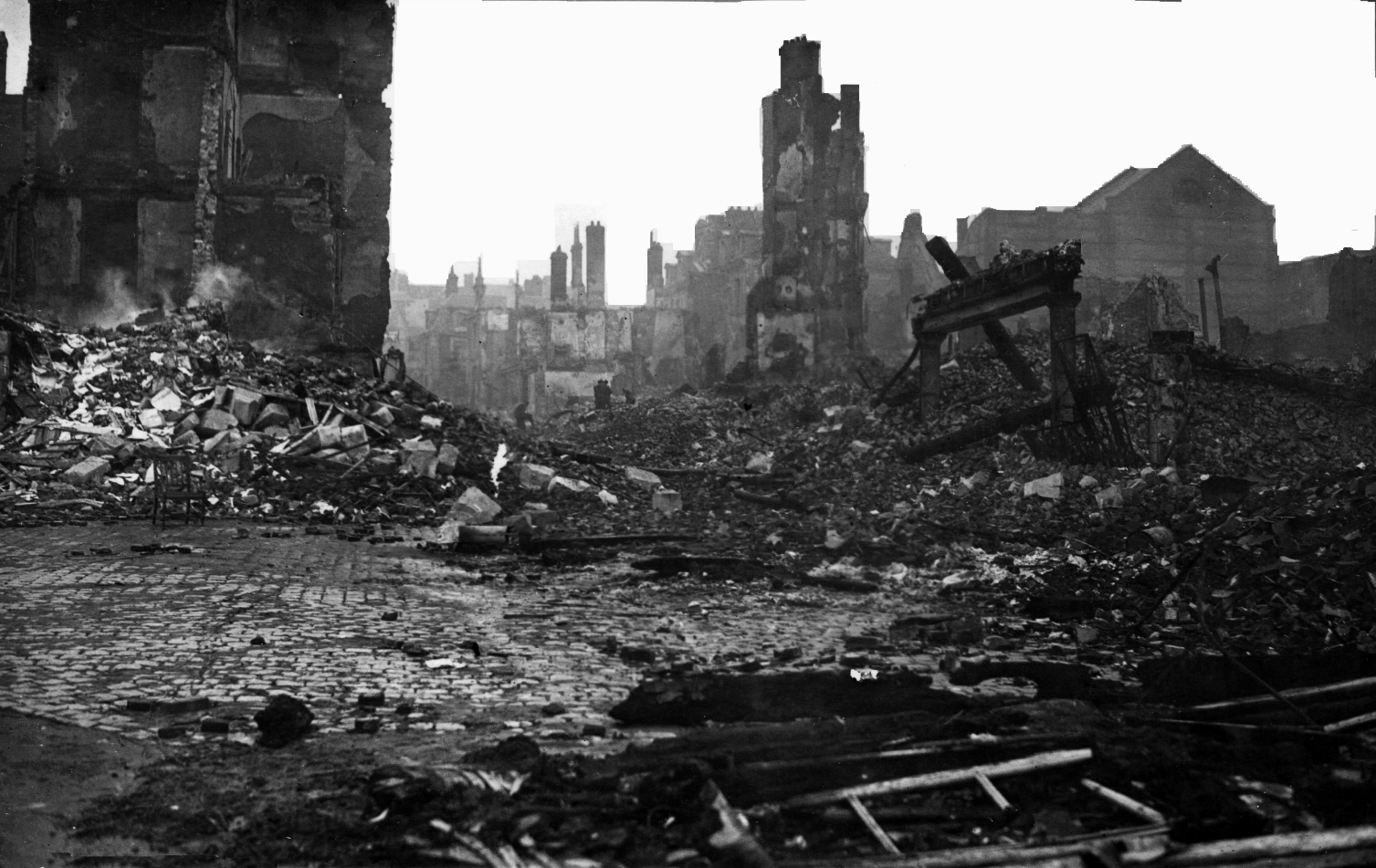 – 01 Photographies Lisieux en ruines: 3 photos (retirages) de la reconstruction de Lisieux en 1945 et 1951, place Victor Hugo et Grande rue. Dont 2 sous la neige en 1945.