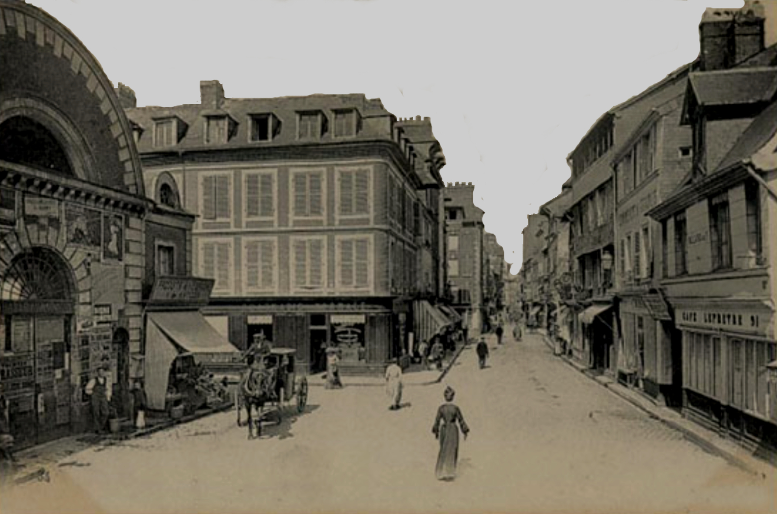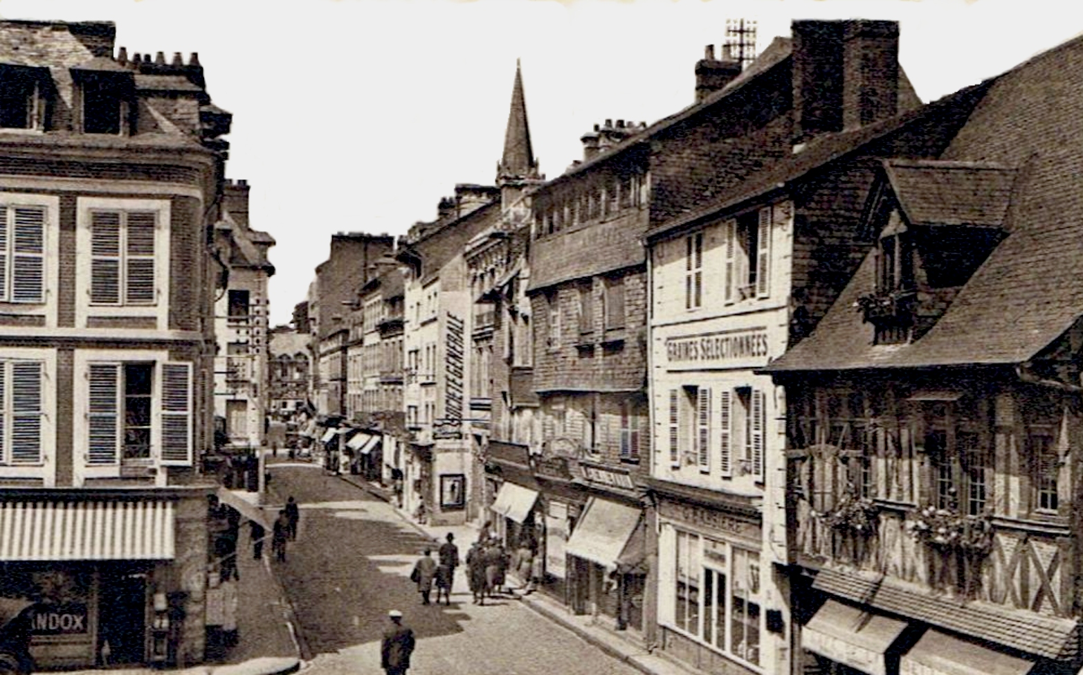 Au Moyen Âge, après que la déviation du cours de l’Orbiquet eut permis l’expansion de la ville vers l’Ouest, la rue Pont-Mortain (dont on semble avoir une première trace en 1321 sous le nom de chemin de l’Évêque (caminum episcopi) est devenu un axe central, mais la principale voie de communication avec le sud est toujours la RUE AU CHAR, dont l’extrémité sud est la Porte d’Orbec. En 1390, le tronçon situé à la hauteur de la Halle au blé est astucieusement dénommé la rue de devant la Halle au blé.